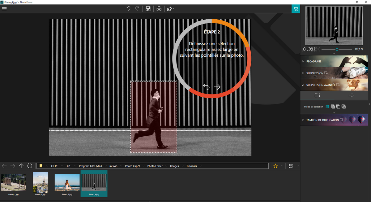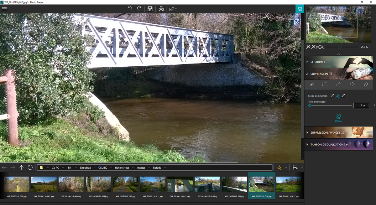 Photo Eraser هي أداة مخصصة لإزالة العناصر غير المرغوب فيها من الصور. إذا تم "إفساد" لقطة بواسطة كابل كهربائي ، فما عليك سوى تحديدها باستخدام أداة Delete. للقيام بذلك ، من الممكن تحديد العناصر بفرشاة ، منطقة مستطيلة ، منطقة مرفوعة ثم النقر فوق مسح لرؤية العنصر يختفي. التقديم صحيح تمامًا وسيعتمد بشكل أساسي على اللقطة المعنية ونوع الكائن وخاصة الخلفية.