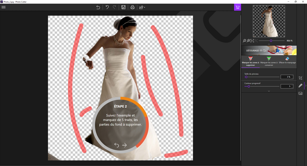 لاقتصاص صورة ، ما عليك سوى تحديد المناطق التي سيتم حفظها أو المناطق التي سيتم حذفها بفرشاة. عندما يقوم المستخدم بضرب العلامة ، يقوم البرنامج تلقائيًا بحساب المناطق المتطابقة المراد حذفها ، مما يسمح بالقطع السريع والجودة. قد يكون من الضروري أيضًا عمل العديد من العلامات من أجل الحصول على نتيجة مثالية.
